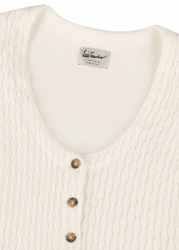 Besonderheiten: Reine Bio-Baumwolle in feinster Qualität, zartes Zopfstrickmuster vorne, Perlstrick am Rücken, Logoplakette in Hornoptik links am Saum